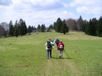 Wir liefen zuerst leicht bergab zur Busstation Stierenberg und dann ein Stück hinauf durch den Wald zum Wäsmeli. Von hier konnten wir Teile des Mittellands und die vielen Windungen der durch Grenchen fliessende Aare sehen. Nur der Himmel über uns marschierten wir gemütlich durch die Grünen Weiden des Jura. Diverse Blumen waren auch schon aus dem Winterschlaf erwacht und bildeten Farbtupfer in den Wiesen, was von der Katharina eifrig mit der Kamera dokumentiert wurde. Und so erreichten wir bald einmal , in ausgelassener und fröhlicher Stimmung, das Restaurant Romontberg, wo wir etwas essen wollten.