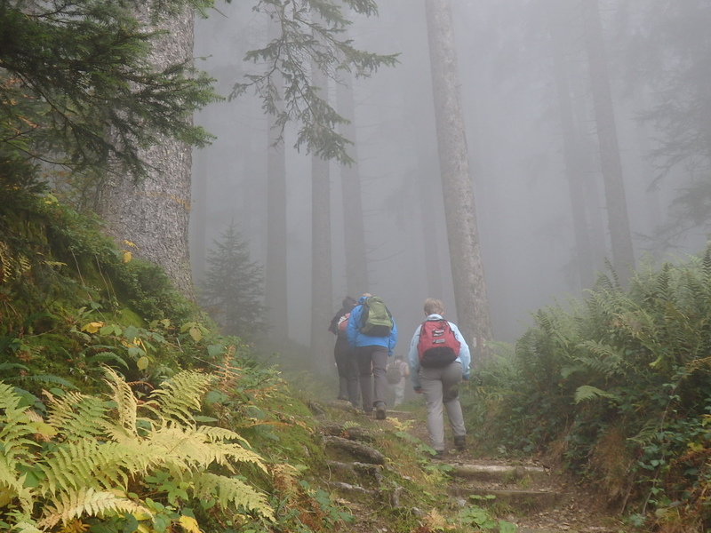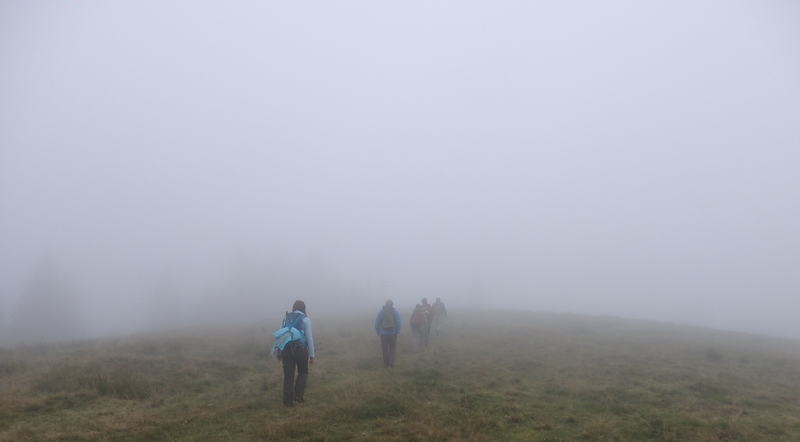 Am Am Sonntag, 27. September 2015 begab sich eine Gruppe FF-Freunde, bestehend aus Werner, Anita, Peter, Maggie, Lisbeth und mir auf eine Nebelwanderung. Werner hatte die Wanderung organisiert. Der Start war in Rothenthurm. Nach einem Startkafi ging es los Richtung Nüsellstock (1479m). Wir waren alle frohen Mutes und guter Hoffnung, dass sich der Nebel mit zunehmender Höhe lichten würde. Dem war aber nicht so. Im Gegenteil, je höher, desto dichter war der Nebel. Nichtsdestotrotz gings über die Ruchegg (1206m) auf die Ronenegg (1200m). Mangels Aussicht in die Weite gab’s dafür viele wunderschöne herbstliche Details zu sehen in der Nähe. Die Landschaft erschien in einem mystischen Licht, was durchaus auch seinen Reiz hatte. Werner führte uns weiter zum Steinschlag (1252m) und von dort war es nicht mehr weit auf den Nüsellstock (1479m), wo wir unsere Mittagsrast hatten. Allerdings nur ganz kurz, der nasskalte Nebel kroch einem gehörig in die Knochen und es gluschtete niemanden, noch länger zu verweilen. Werner erklärte uns, welche Aussicht man hätte bei schönem Wetter. Wir konnten es nur erahnen, denn weiterhin befanden wir uns im dichten Nebel. Weiter gings zum Teuffeli und dann ziemlich steil hoch auf die Brüschrainhöchi (1515m), dabei hatten wir dann schnell wieder warm. Von der Brüschrainhöchi gings dann definitiv nur noch runter bis zur Haggenegg (1414m), wo wir im Restaurant einkehrten. Nach der Stärkung machten wir uns auf den Weg nach Alpthal, wo uns das Postauto nach Einsiedeln brachte.