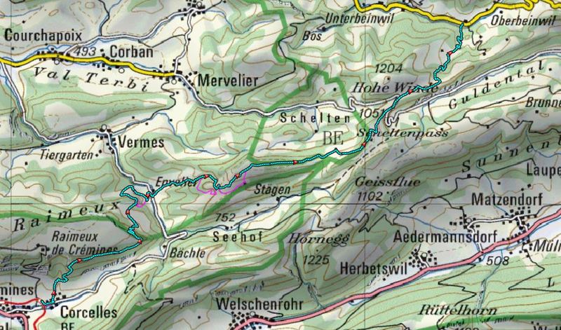 Wie ich in Corcelles aus dem Zug steige, der mich von Solothurn via Gänsbrunnen hierher gebracht hat fällt wenigstens kein Nass vom Himmel, so wie es im Wetterbericht vorhergesagt wurde. Im Dorf geht es gleich bergauf dem Gore Virat folgend und auf dem Weg Richtung Les Raimeux. Kaum im Wald zweigt mein Weg aber nach rechts ab, kreuzt den Bach und geht in langer Steigung schräg den Hang hinauf bis in die östlichste Ecke des Hochplateaus Les Raimeux wo bald der Hof Le Petit Pré auftaucht. Ihm gegenüber zeigt der Wegweiser nach Envelier. Ein schmales Weglein führt durch eine steile Waldpartie hinunter nach Le Grand Ramboden. Im Wald hat es vor allem viel Grosse Schlüsselblumen und auch überraschend viel weissen Pestwurz. Am untern Waldrand geht der Weg noch etwa 10 Minuten über eine sehr nasse Wiese bevor man ein Strässchen erreicht. Auf diesem geht es nun hinunter nach Envelier, ein kleines Nest mit Kapelle das am La Gaviare liegt. Der nächste lange Anstieg bringt mich durch viel Wald hinauf nach Le Petit Schönenberg, wobei ich im oberen Teil den alten, nicht markierten, etwas steileren aber kürzeren Weg wähle. Unten in Envelier hat sich plötzlich die Sonne gezeigt so dass es im Aufstieg recht warm ist. Bei meinem weiteren Aufstieg nach Le Grand Schönenberg fallen dann aber plötzlich wieder Tropfen so dass ich mich entscheide mein Sandwich unter einer grossen Tanne zu verzehren. Den Hof Le Grand Schönenberg lasse ich rechts liegen und steige über Weiden und ein Paar Stacheldrahtzäune direkt zum Schöneberg auf. Der Himmel hat inzwischen ein Einsehen gehabt und die Tropfen eingestellt. Bis Rotlach bin ich nun auf dem Höhenrücken und an diesem Wegstück stehen etliche markante alte Bäume. Bei Rotlach geht es dann hinauf zur Krete und vor dem Wald sind noch ein paar Krokusse zu sehen. Nach dem Überschreiten der Krete ist man in ein paar Minuten am Berggasthaus Matzendörfer Stierenberg. Hinunter zum Scheltenpass ist es nicht sehr weit und auch der vordere Erzberg ist bald erreicht. Leider ist die Wirtschaft geschlossen, sonst hätte ich mir einen Schümlipflümli gegönnt. Der Wanderweg führt nun Richtung Neuhüsli. Ich verlasse ihn aber bald und wähle den direkten, sehr steilen Weg hinunter nach Schachen. Da Alles sehr nass ist muss ich vorsichtig gehen; so sehe ich das Postauto nur noch von oben. An der Haltestelle habe ich dann Zeit auf trockene Schuhe zu wechseln und mich sonst noch etwas zu büschelen. Plötzlich hält ein Mitarbeiter vom "Chratten" an der Haltestelle und bietet mir an mich mitzunehmen. Freundlicherweise fährt er mich bis zum Bahnhof Zwingen, nochmlas Dank dafür.