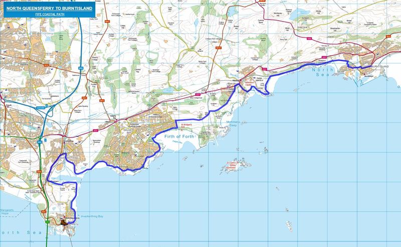 Auf einem felsigen Pfad umrunden wir die Inner Bay (Naturschutzgebiet) und sehen hinüber nach Dalgety Bay bevor wir Royal Burgh of Inverkeithing mit schönen alten Häusern durchqueren. Hier haben wir auch Gelegenheit unsern Wasservorrat zu ergänzen. Den Ort verlassen wir um wieder an die Küste zu gelangen. Vorbei an St. David's Harbour kommen wir nach Dalgety Bay, ursprünglich ein kleines Fischerdorf, heute vorwiegend Schlafstadt für Edinburgh. Eine Weile folgen wir noch der Küste und dann führt uns der Weg etwas landeinwärts zur St. Bridgets Kirk, schon seit langem nur noch die Ruine einer Kirche die wir noch aus unserer Zeit vor fast 50 Jahren kennen. Hier wollen wir Picknick machen doch es überrascht uns ein für Schottland nicht unüblicher Schauer. Nach ein paar Minuten ist der Spuk vorbei und wir können unser Sandwich doch noch geniessen. Etwas weiter landeinwärts und am ersten von vielen Golfplätzen auf unserer Tour vorbei erreichen wir Aberdour wo wir einen kleinen Coffee Shop für eine verdiente Pause finden. Vorbei an Aberdour Castle erreichen wir wieder die Küste und sind nun paralell Zur Eisenbahnlinie unterwegs, passieren auf dem Weg nach Burntisland noch die