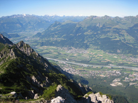 Am Gipfelkreuz nahm ich dann aber zuerst mal eine Brotzeit zu mir und genoss den Tiefblick auf Liechtenstein und das Rheintal sowie die Fernsicht auf die Berge des Glarner Landes, die an ihren markanten weißen Firnhauben gut zu erkennen waren, sowie auf das Rätikon und die Gipfel in ganz Vorarlberg.