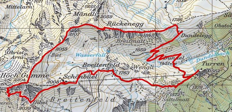 Die Wanderung hat den Schwierigkeitsgrad T2-T3. Vom höchsten Punkt - Höch Gumme 2204 müM. - gelangt man auf dem Rundwanderungsweg nach Schönbüel. Es ist der Weg, der auf der Karte oben eingezeichnet ist. Wir haben jedoch die Abkürzung genommen, die aber recht ausgesetzt und steil über Felsen hinunterging. Diese Abkürzung eignet sich nur bei trockenem Wetter und nur für geübte Wanderer. Auf Schönbüel gibt es ein Restaurant, in das wir auch eingekehrt sind. Danach dauert es etwa eine Stunde, bis man Turren, den Ausgangsort wieder erreicht.