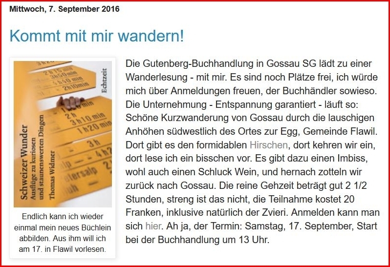 | 17.09.16 Gossau SG - Egg: Wanderlesung mit Thomas Widmer ("Schweizer Wunder") (Beat) |