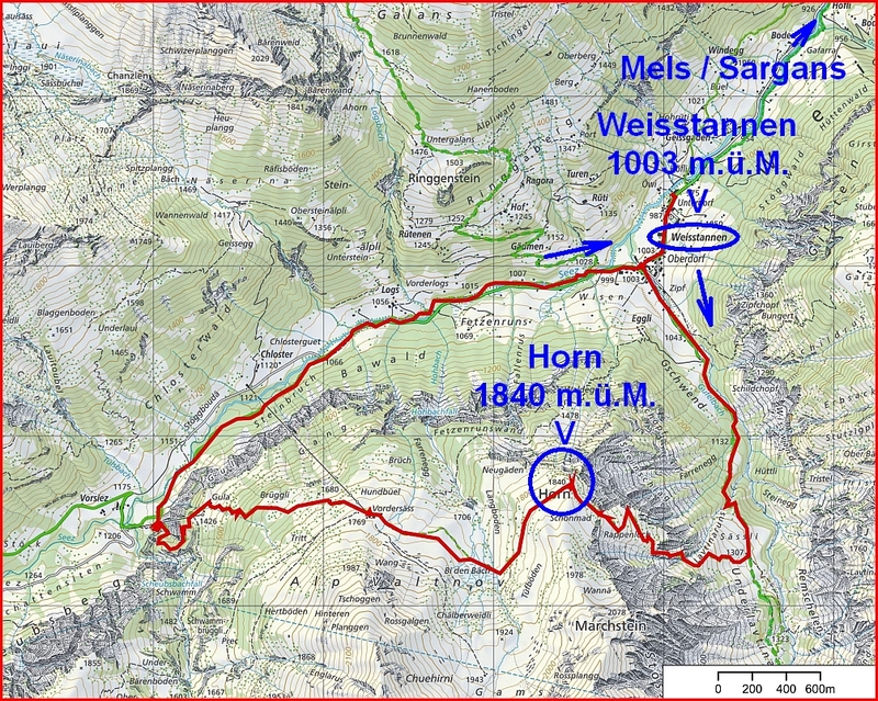ab Weisstannen (1003m) via Sässli (1307m) und Rappenloch (1701m) zum Horn (1840m).