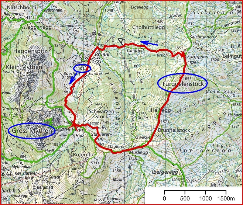 und weiter via Müsliegg / Zwäcken / Halbegg zum Furggelenstock (1655 m.ü.M.).
