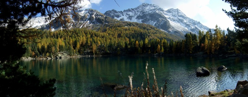 der Ruf der goldenen Lärchen erreichte uns dieses Jahr aus einer der entferntesten Ecken (für uns Basler) der Schweiz, aus dem Puschlav. Nach einer langen Zugfahrt stiegen wir auf der Berninapasshöhe in das Postauto ins Puschlav um. Wir fuhren auf der Passstrasse nach Süden und verliessen bei der Haltestelle Pozzulasc den Bus.