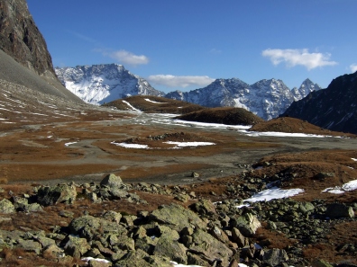 Die Waldgrenze hatten wir inzwischen überschritten und vor uns lag eine abwechslungsreiche alpine Landschaft. Von hier aus konnten wir die Furcola da Cardan (Pass links der Bildmitte) erkennen, über die wir zum Piz Ursera (Dritter Gipfel rechts der Bildmitte) aufsteigen mussten.