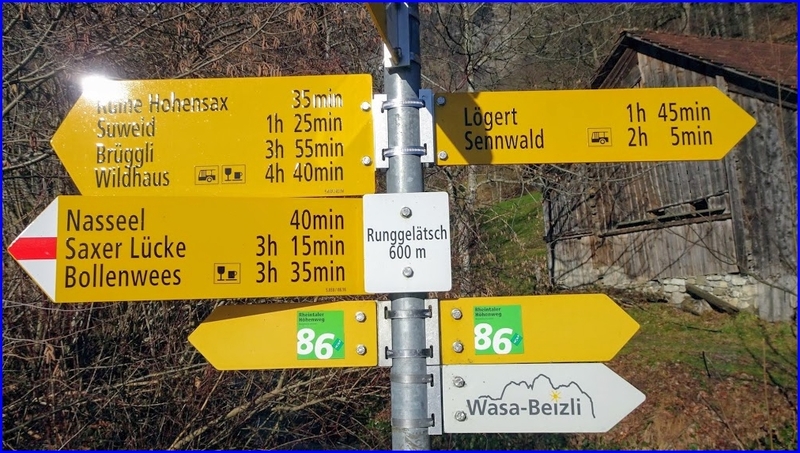 Von der Bahn- (und Bus-)Haltestelle Salez-Sennwald im St. Galler Rheintal gelangen wir, vorbei an Burgruine und Zeughaus der ehemaligen Grafschaft und Landvogtei Sax-Forsteck (-> Burg Forstegg), nach Sennwald-Lögert. Dort erreichen wir den Rheintaler Höhenweg (-> Wanderland-Route 86 / Etappe 4). Oberhalb von Grüt führt der Weg an der Baustelle der neuen Talstation der Stauberen-Luftseilbahn vorbei.