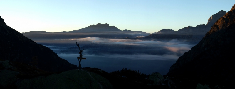 Nach dem Nachtessen gingen wir nochmals hinaus und sahen, wie sich das Licht der letzten Sonnenstrahlen in den Nebelbänken über dem Tal verfingen und es langsam Nacht wurde.