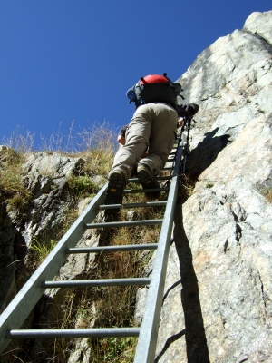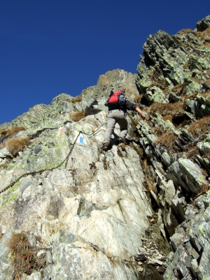 Kurz vor der Hütte teilt sich der Wanderweg in einen einfacheren und einen anspruchsvolleren Schlussaufstieg. Wir entschieden uns für den schwierigeren Weg, der jetzt, da das Eis und der Schnee weggeschmolzen waren, gut zu bewältigen war. Wie man auf dem Foto sieht, sind Trittsicherheit, Schwindelfreiheit und Felskletterei nötig, um dieses Wegstück zu überwinden.