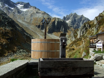 Nachdem wir unsere Schlafstellen bezogen hatten machten wir uns erst einmal auf der Terasse der Etzlihütte bequem. Auf dem linken Bild seht Ihr den Badebottich, in dem die müden Wanderer/innen nach einem anstrengenden Tag ein heisses Bad nehmen können (siehe Rückblick von Marcel) . Rechts seht Ihr das "Hüttenungeheuer" Nero, der auch das Seine zur gemütlichen Hüttenunterhaltung beigetragen hatte.