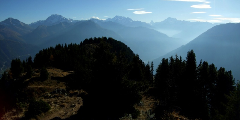 Wir wanderten auf dem Grat des Riederhorns für eine kurze Strecke in Richtung Süden und blickten dort ins Rhônetal hinunter und nochmals auf die Berge um den Simplon und das Mattertal.