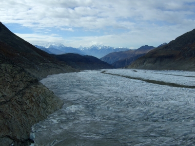 Weiter ging es auf dem Gletscherweg bis unterhalb Punkt 2290, wo wir den Weg verliessen. Stetig steigend, dieses Mal auf der Sonnenseite, erreichten wir Hohbalm, einen weiteren schönen Aussichtspunkt. Von dort wanderten wir, stets begleitet von dem eisigen Wind, zur Bergstation Bettmergrat hinauf. Das dortige Restaurant - wie die Bergstation ein architektonischer Schandfleck - bot einen überwältigenden, wind- und wettergeschützten Rundblick auf die imposante Bergwelt.