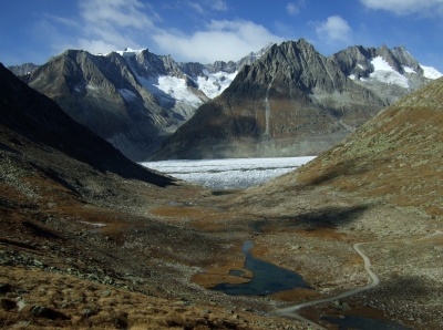 Von der Gletscherstube aus wanderten wir über den Staudamm des Vordersees und wählten den Weg hinauf zum Tälligrat. Schon während des Aufstiegs konnten wir auf die Ebene blicken, die früher vom Märjelesee völlig bedeckt wurde. Übrig geblieben sind heute nur noch wenige klägliche "Pfützen".