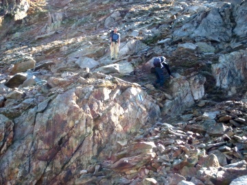 Wir steigen über Schroffen und groben Blockschutt ab zum Punkt 2658. Tief unter uns fahren die Züge durch den Furka-Basistunnel. Hier beginnt der schwierigste Teil des heutigen Tages. Wir müssen eine rutschige, da immer noch mit Frost bedeckte, Schuttrinne hinunter. Die Stöcke kann man hier getrost versorgen, denn wir brauchen beide Hände für diesen anspruchsvollen Abstieg.