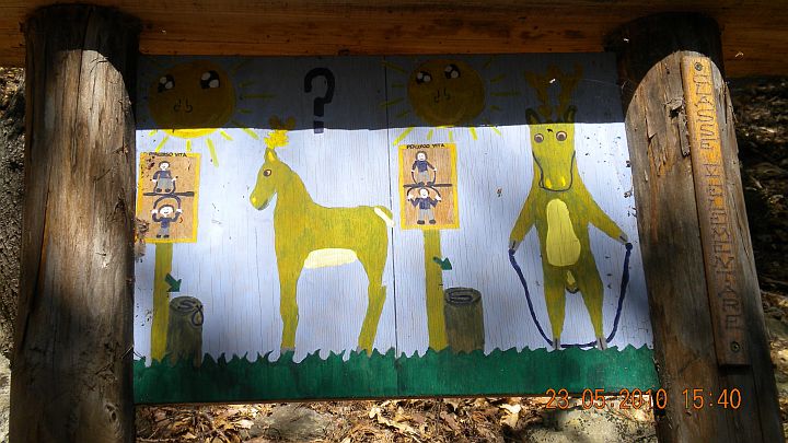Entlang des Weges sind 15 bemalte Holztafeln aufgestellt.