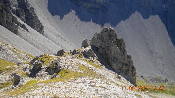 Alpschelegrat; im Geröllhang davor deutlich die Wegspur dorthin: