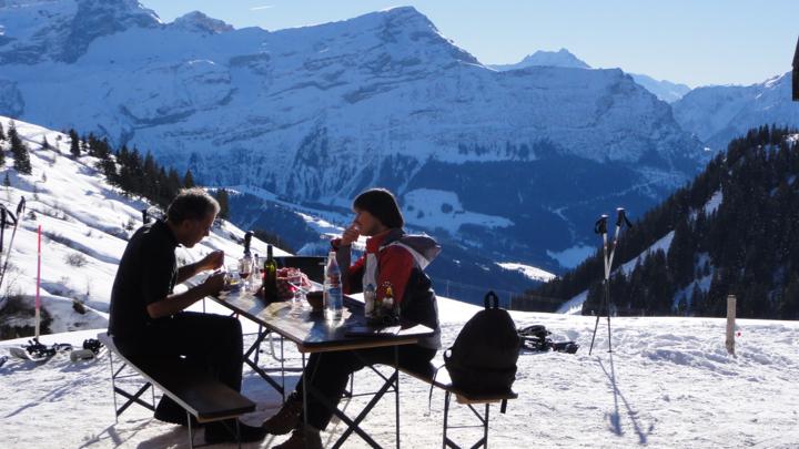 Hier haben wir aber noch nicht entschieden, welchen Weg wir wählen werden, jenen Richtung Ruogig oder jenen nach Ratzi, wo an beiden Stellen wieder Seilbahnen ins Schächental hinunter führen. Der Weg via Ruogig bis nach Eggbergen ist eigentlich nur mit Schneeschuhen begehbar. Später werden wir aber feststellen, dass die Schneeschuh-Wanderer den Weg nach Eggbergen so gut "präpariert" haben, dass er auch für uns Normal-Wanderer problemlos begehbar ist.