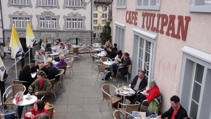 Auf dieser Sonnenterrasse mit Blick auf den Klosterplatz lassen wir unseren Wandertag ausklingen: