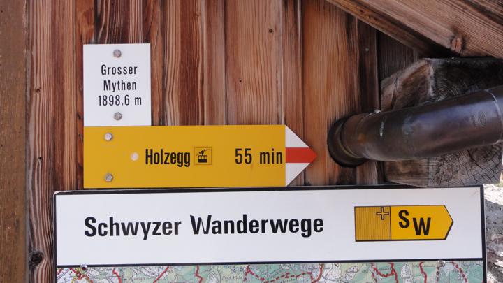 Gemäss diesem Wegweiser wäre der Aufstieg ab Brunni (1100m) bis zum Grossen Mythen (1900m) in 2:20 Stunden zu schaffen. Werner hat diese Strecke am vergangenen Donnerstag als Abendspziergang in 1:30 Stunden hingelegt und er kennt einen "Extremisten", der diesen Aufstieg in 28 Minuten bewältigt.