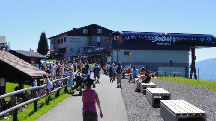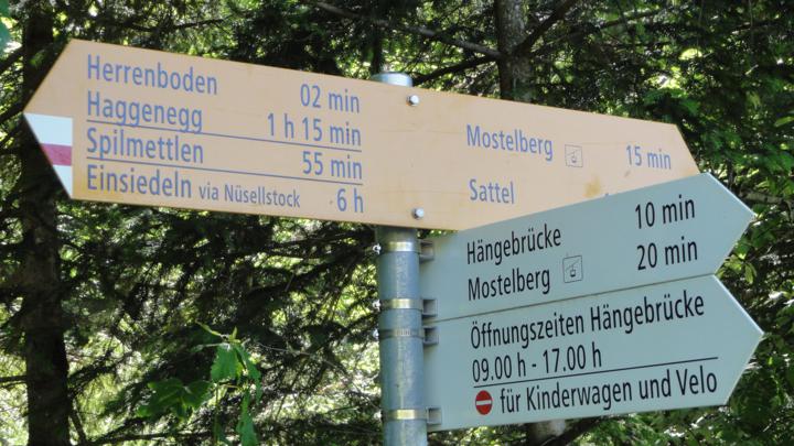 - Mostelberg und von dort mit der Gondelbahn hinunter nach Sattel. Ein Teil der Gruppe wählt bei der Brüschrainhöchi den Abstieg via Haggenegg nach Brunni im Alptal.