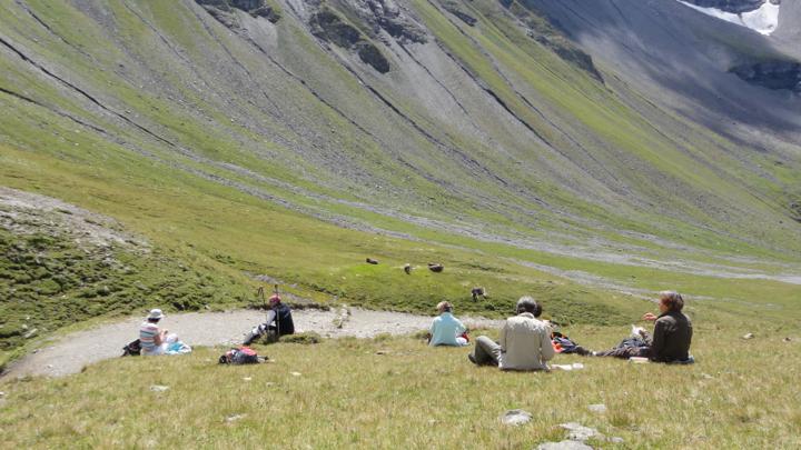 An einer windgeschützen Stelle, etwas unterhalb der Passhöhe, halten auch wir Mittagsrast: