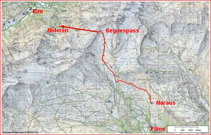 Von Naraus ob Flims über den Segnespass (Pass dil Segnas) zur Tschinglen-Alp bei Nideren ob Elm.