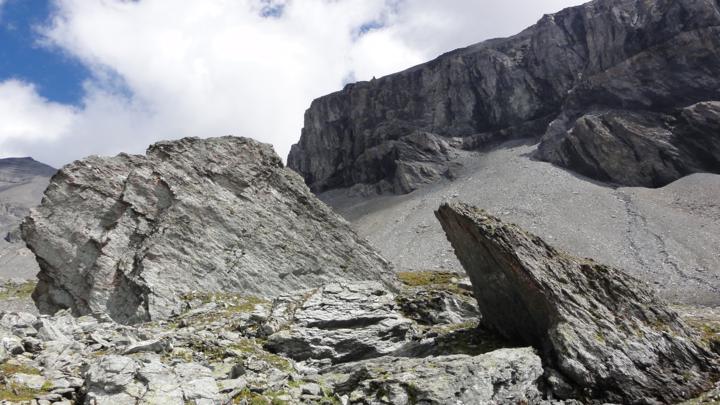 Vor uns die markanten Tschingelhörner (Tschingelhoren), an denen die Glarner Hauptüberschiebung deutlich zu erkennen ist. Paradoxerweise liegt hier älteres Gestein (250-350 Mio. Jahre alter Verrucano) auf jüngerem (35-50 Mio. Jahre alter Flysch), dazwischen die dünne "Schmierschicht" aus Lochsitenkalk:
