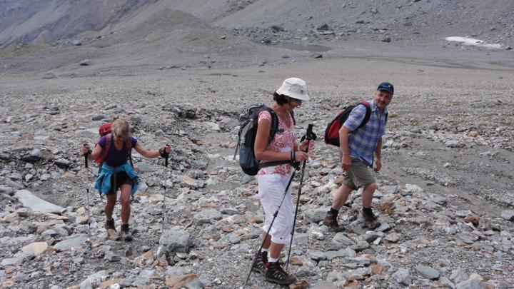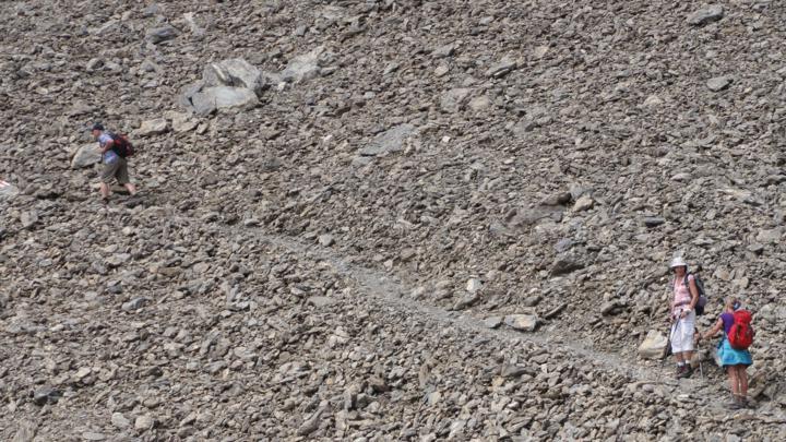 Bogenförmig haben wir nun einen steilen Geröllhang und weiter oben ein kleines Schneefeld zu durchqueren: