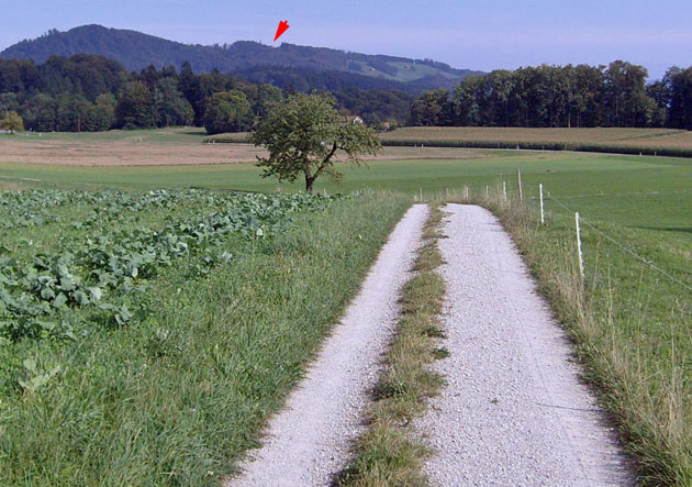 Nach dem Weiler Türlen folgten wir dem Veloweg neben der Strasse Richtung Hausen bis zur Bushaltestelle Tüfenbach, wo wir links abbogen. Wir durchquerten den Weiler und folgten dem Weg hinauf in Richtung Albishorn bis zur Wegscheide die wir ca. 400 Meter nach Tüfenbach erreichten. Abermals verliessen wir hier die offiziell markierte Route zum Albishorn (2). Statt dem Wegweiser zu folgen, gingen wir den Weg rechts runter, um nach ca. 80 Meter (beim Fahrverbotsschild) links hinauf in den Wald abzubiegen. Der Grund hierfür ist die wunderschöne Aussicht auf den Zugersee, die Rigi, den Pilatus und (bei klarer Sicht) die Berner Alpen, die auf der Normal-Route nicht genossen werden könnte.
