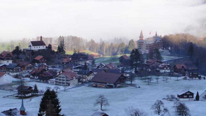 Blick über Flüeli-Ranft, links die Flüeli-Kapelle, rechts das Jugendstil-Hotel Paxmontana: