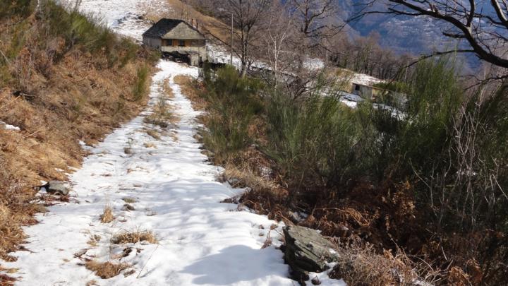 Auf meiner Zusatzschlaufe in Richtung Pian di Nar bin ich froh um mein GPS-Gerät. Ich muss nämlich auf den höherliegenden Weg kommen, der von der Cap. Albagno her kommend nach Mornera führt und das ist im verschneiten Wald gar nicht so einfach. Der Seilbahn-Maschinist erklärt mir später, von einer Wanderung bis zur Cap. Albagno sei momentan abzuraten; es liege dort viel Schnee uns es herrsche Lawinengefahr: