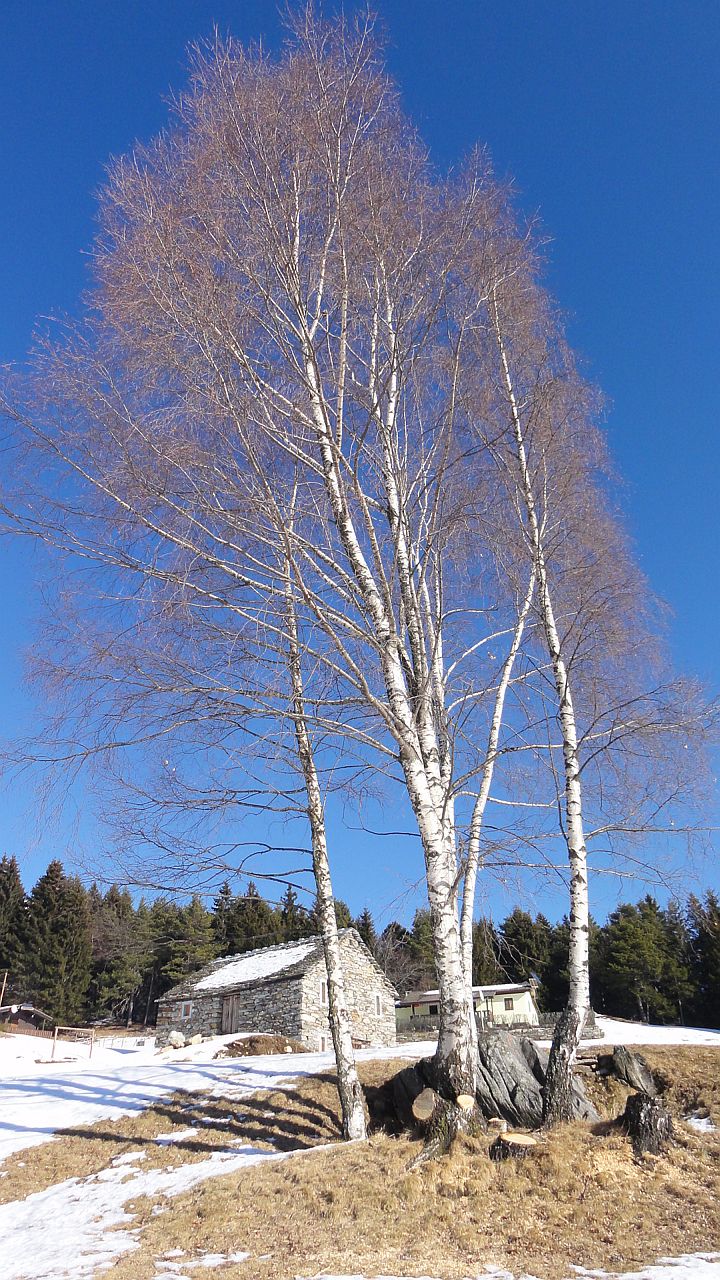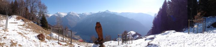 Das Blickfeld öffnet sich nun nach Westen. Auf der anderen Talseite, ebenfalls auf 1300m liegt Mornera, wo ich am vergangenen Samstag auch in einer Winterlandschaft angekommen bin. Rechts darüber vermutlich der Gipfel des Gaggio / Cma del Uomo: