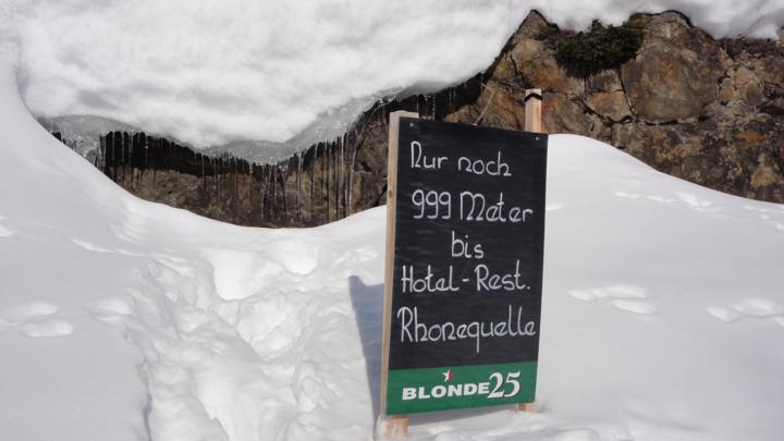 Nach einer guten Stunde (um 11:20) erreiche ich das Hotel-Restaurant Rhonequelle, wo unzählige "Schnee-Velos" und Schlitten für die Talfahrt bereitstehen; aber ich will ja weiter vorwärts nach oben: