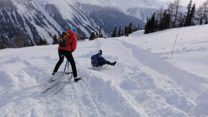 Wem dieser 1000-Meter-Aufstieg zu streng ist (und es ist, vor allem im oberen Abschnitt, wahrlich kein Spaziergang!), hat die Möglichkeit, sich nach Vorbestellung mit dem Pistenfahrzeug hochfahren zu lassen und den Abstieg zu Fuss oder auf einem Schlitten zu machen: