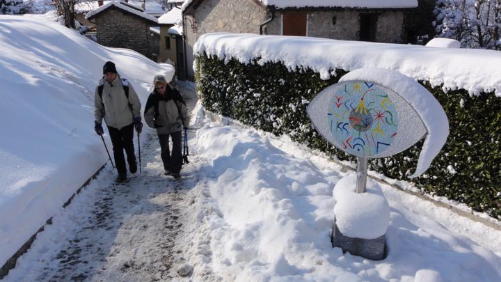 In Gandria, wo der Olivenweg endet, entscheiden wir uns für den 500m-Aufstieg nach Brè (sofern der verschneite Weg dies zulässt):