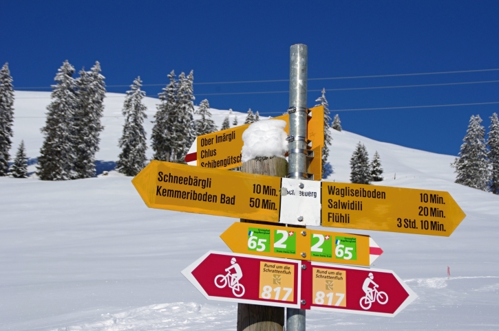 Beim Wagliseiboden zweigen jede Menge Wander- und Schneeschuhwege ab. Zu Geri's Beizli ist es noch eine Stunde.