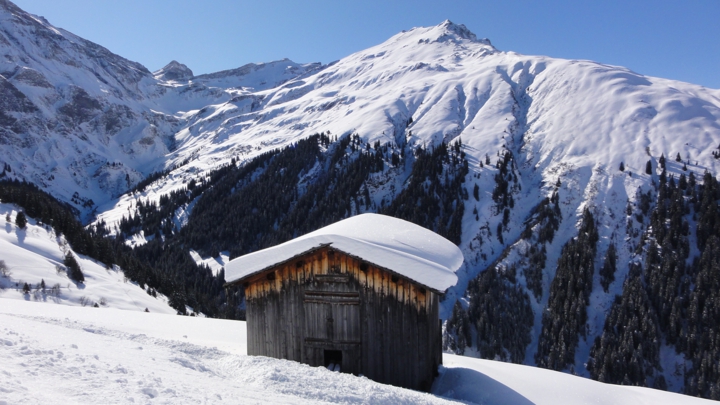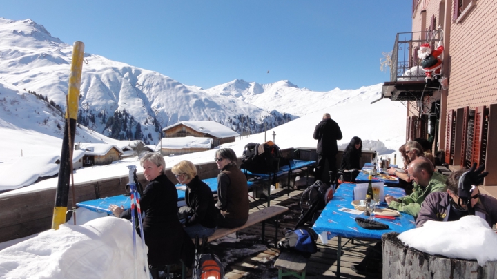 Um 12:15 sind wir zurück in Usser Glas. Bevor wir im Berggasthaus einkehren, halten wir Mittagsrast bei frühlingshaften Temperaturen:
