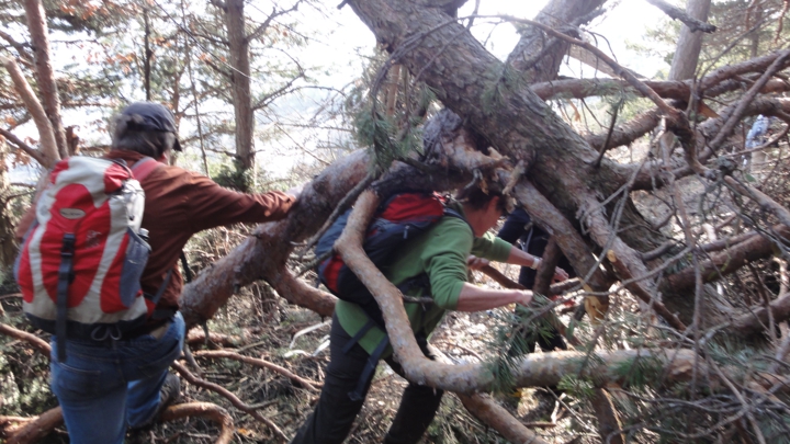 Die Waldschäden hier sind dramatisch; alle paar Meter müssen wir umgestürzte Bäume unter- / durch- / um- oder überklettern. Es wird wohl Wochen dauern, bis hier wieder ein ungehindertes Durchkommen möglich sein wird: