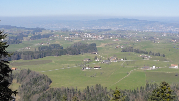 Der Rossberg ist eher eine weite sattelförmige Terrasse mit unverstellter Aussicht Richtung Ost und West. Beim Scherenspitz ist zwischen den Bäumen der Durchblick nach Norden über Rapperswil und das Zürcher Oberland hinweg möglich: