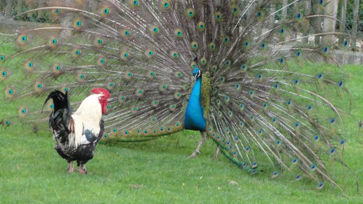 Auf dem anschliessenden Weg (kurz vor Oberkirch) entschädigt uns ein farbenprächtiger Pfau für die fehlenden Sonnenstrahlen: