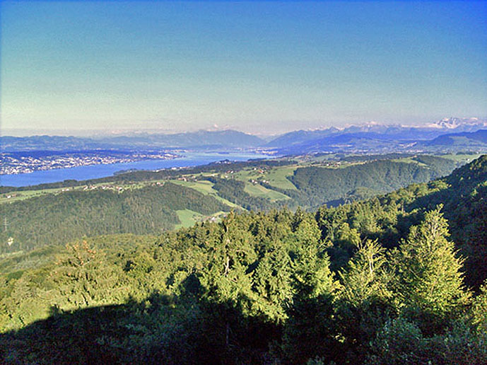 ....dies ist der Ausblick Richtung Südost, der sich an gleicher Stelle bei trockener Luft bietet: Der Zürichsee inkl. Alpenpanorama, aufgenommen vom Albishorn am 11.09.2011