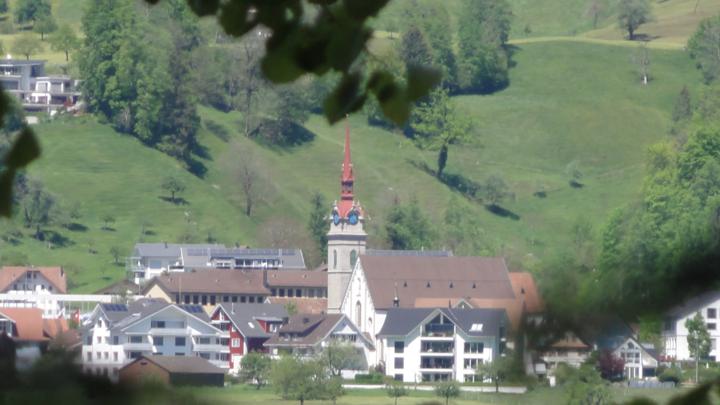 Der Morgartenberg (hier im Hintergund der Pfarrkirche St. Antonius) ist für Innerschweizer Verhältnisse ein "Winzling". Mit seinen 1244 Höhenmetern überragt er das Dorf Rothenthurm nur um gut dreihundert und den dahinterliegenden Ägerisee um fünfhundert Meter: