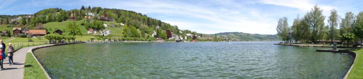 Der Ägerisee mit Unterägeri (Bildmitte), wo wir in vier Stunden ankommen werden; am rechten Seeufer Oberägeri: