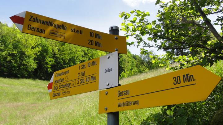 Wir wählen den Weg über Sellen und die "Zanhwehkapelle"; etwas tiefer verläuft der Waldstätterweg über Rüteli: