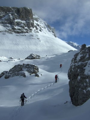 Entlang der Flanke des "Chaiserstocks" stapften wir unsere frische Spuren in den noch völlig unberührten Schnee. Es war wunderschön! Doch besonders wenn es steil bergaufging, wurden die Kräfte des Vorspurers René ziemlich stark beansprucht. Aber auch alle anderen wurden gefordert.