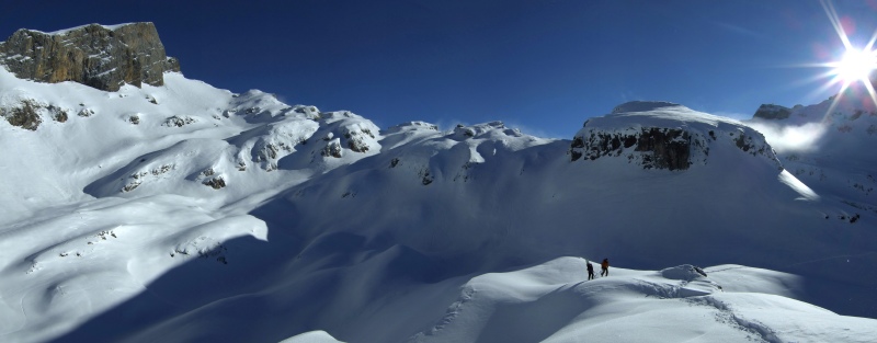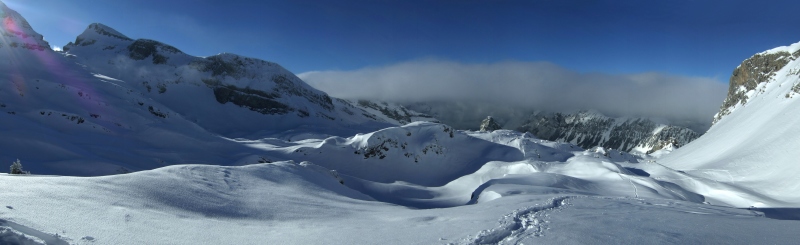 und auf das Panorama unterhalb des "Chaiserstocks". Bald bemerkten wir, dass wir doch nicht ganz alleine in dieser Winterlandschaft waren. Schon bald gesellten sich zwei Skitourenfahrer, die vom "Rossstock" kamen, zu uns.