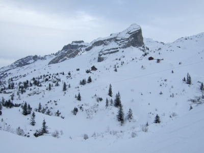 Gestärkt und entlastet marschierten wir einfach mal bergauf, um uns einen ersten Überblick über die nähere Umgebung zu verschaffen. Die Schneeverhältnisse waren traumhaft: Alles war tief in frischem Pulverschnee versenkt, so dass wir bereits kurz nach der Hütte das Gefühl bekamen, als erste diese unberührte Welt zu betreten. Begeistert stapften wir im 'Gänselimarsch' bergauf. Bei den "Oberen Hüttli" zog es Pia und Rosmarie wieder in die "gute Stube" der Liderenhütte zurück.
