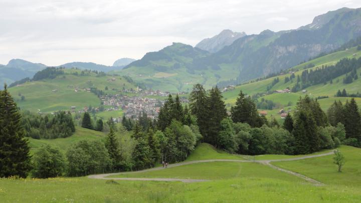 In der Bildmitte das Dorf Stoos, schön gelegen auf einer Sonnenterrasse hoch über dem Muotatal, dahinter die Chlingenstock-Fronalpstock-Kette: