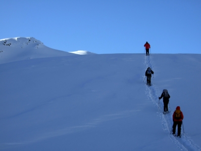 Am nächsten Morgen staunten wir alle nicht schlecht: Obwohl wir gestern 1300 Höhenmeter zurückgelegt hatten, und es für die meisten von uns die erste Schneeschuhtour in diesem Jahr war, klagte niemand über Muskelkater. So garstig die Wetterhexen gestern über uns hereingebrochen war, so zahm und friedfertig zeigten sie sich heute: Vor uns lag eine absolut unberührte, weisse Pracht in absolut traumhafter Kulisse. Glück pur!